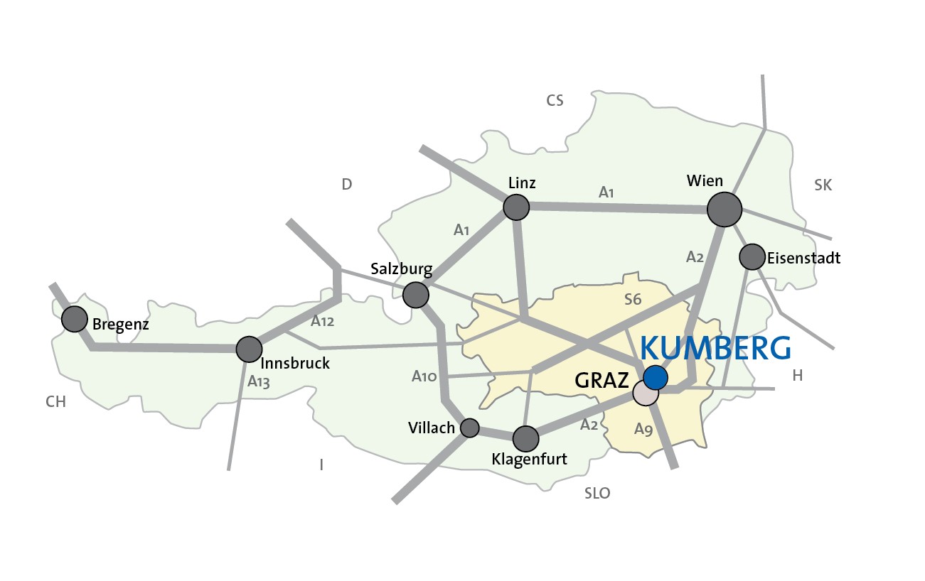 Aus Richtung Deutschland, Salzburg, Oberösterreich: A9 Phyrn-Autobahn, Abfahrt Graz-Nord, B67 / L328 / L330 / L329 Richtung Weiz & Kumberg.